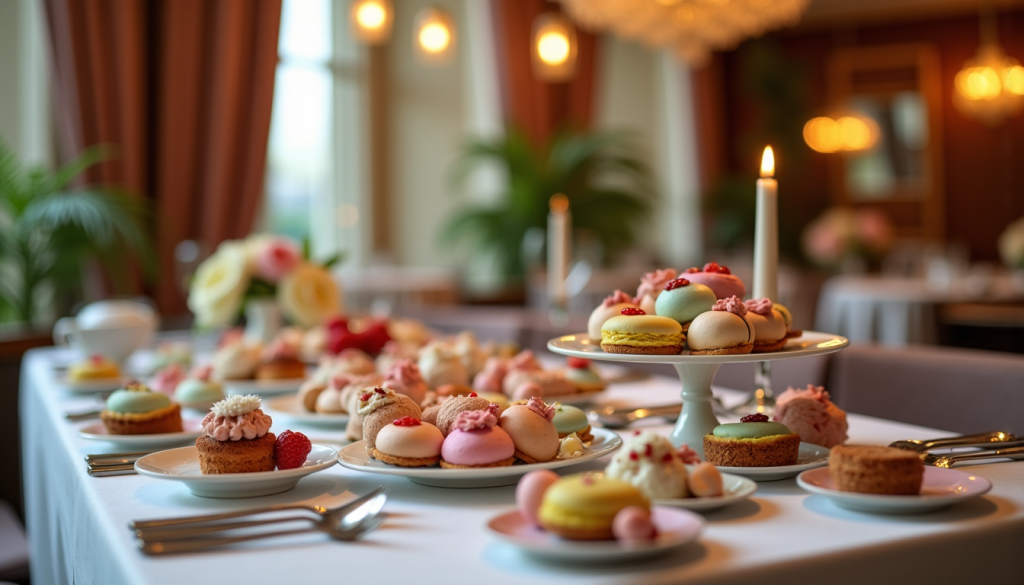 Après les saveurs salées, une sélection de douceurs vient parfaire l’expérience culinaire. La tendance est aux mini-desserts, permettant aux invités de goûter à plusieurs créations sans excès.